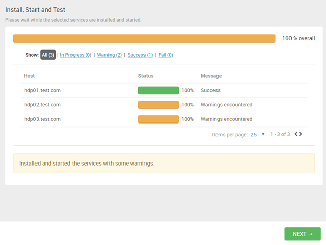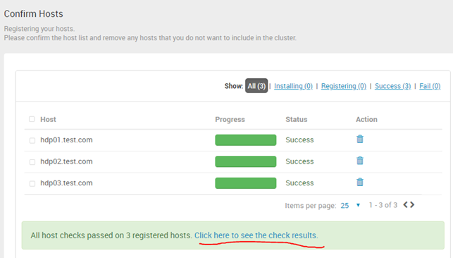 이상없이 진행된다면 모든 노드들의 status가 success로 나오고 fail이 뜰 경우 클릭하면 무엇이 문제인지 확인이 가능하다. 그동안 진행한 과정에서 누락 또는 실수로 인한 이슈들이 주로 나올 수 있다.(기본 도구들(자바,파이썬)의 경로나 방화벽,권한문제가 있을 가능성이 높음)